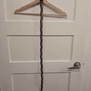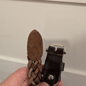 Stylish braided hand made belt leather in multicolor design. Features shades of brown, tan, and white.