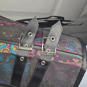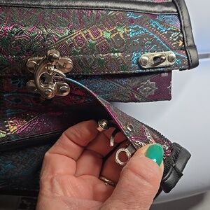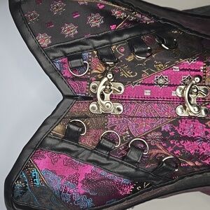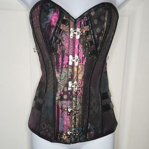Stylish corset featuring vibrant multicolor patterns and metal clasps. Perfect for a bold fashion statement.