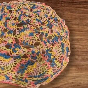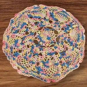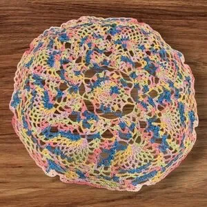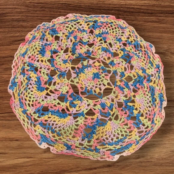 14" across. Add a touch of elegance to your space with this multicolor crochet doily. Perfect for enhancing your decor.