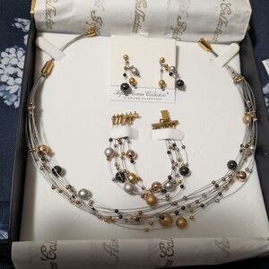 Elegant earrings, necklace, and braclet. featuring a blend of gold, silver, and black tones. Perfect for adding a touch of sophistication to any outfit. Fifth Avenue collection.