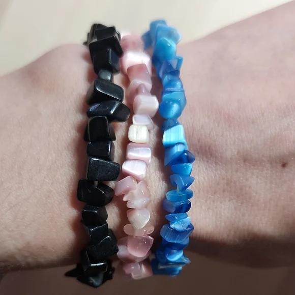 Enhance your style with this set of multicolor gemstone chip bracelets. Featuring black, pink, and blue stones, these bracelets add a vibrant touch to any outfit.
