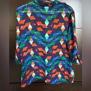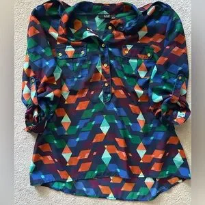 Chic sheer blouse with geometric design and cuffed sleeves. Features a blend of blue, green, and orange hues. Ideal for a stylish look.