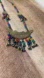 This stunning necklace features vibrant glass beads in red, blue, green, and yellow, complemented by elegant metal accents. Small bells at the tips make a lovely light sound.