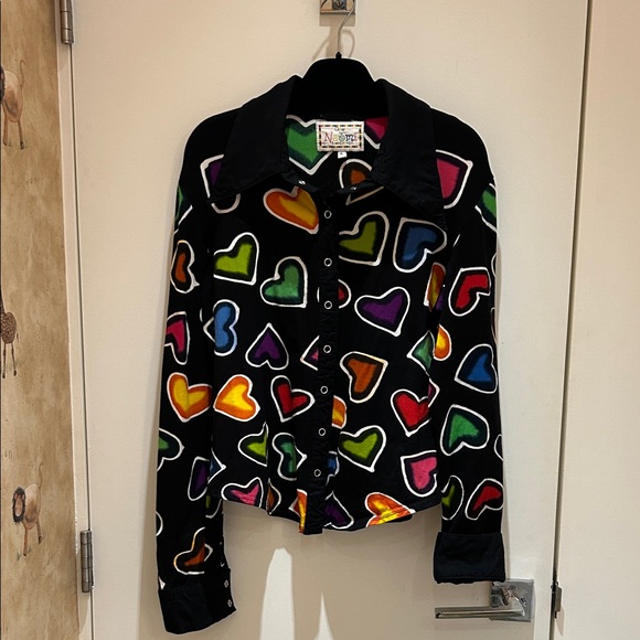 Black jacket with vibrant heart pattern. Features multicolor design for a bold look. Perfect for a statement outfit.