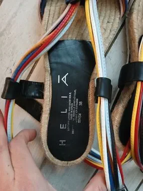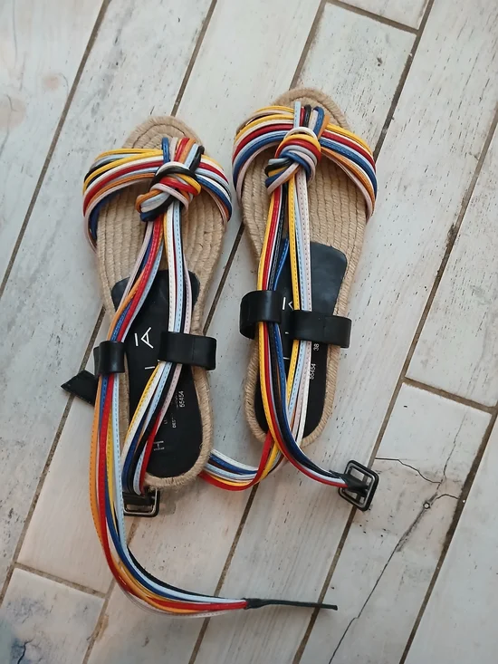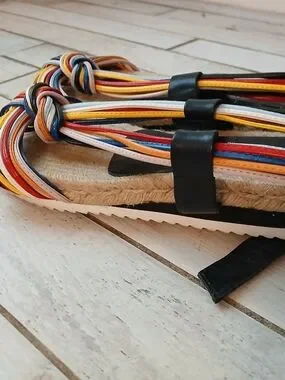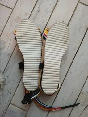 Super cool sandals with bright multicolor knotted leather straps on a neutral woven footbed. Dual xoloured soles in white and black. Adjustable ankle ties with buckle. Lightweight summer sandals that I am always complimented on, but have worn a handful of times. They deserve better. :-)