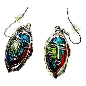 This is a beautiful multi-colored metal and enamel necklace and earrings set. Never worn. The pendant on the necklace is the image of a face with rhinestones for eyes. The necklace is comprised of small, multicolored soft ropes that come together at the end with an alligator clip and chain to adjust length. The earrings are matching but do not include rhinestones on the eyes like the necklace.