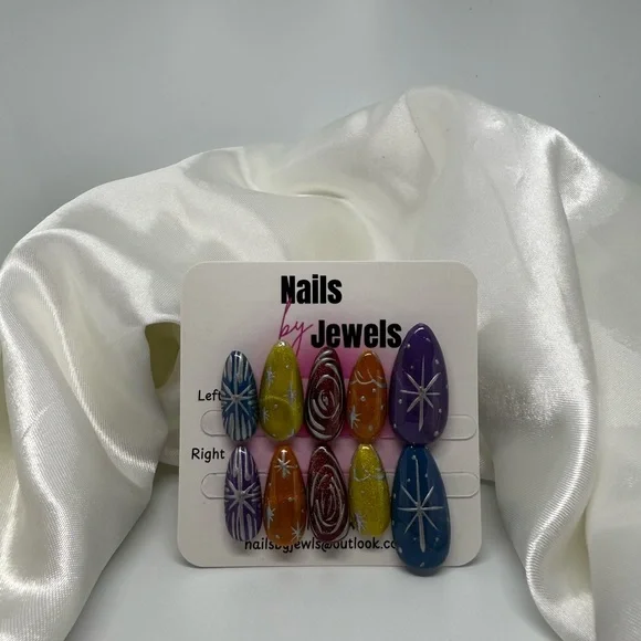 Enhance your style with the vibrant Multicolor Nail Set. Featuring a stunning mix of purple, blue, and yellow, these nails are perfect for any occasion.