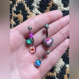 Set of multicolor novelty belly button rings featuring vibrant green, pink, blue and multicolor designs. Each piece offers playful, eye-catching accents and secure ball closures. Ideal for personal expression and everyday wear. Includes a green 'F*** ME' style, blue 'Virgin' style, pink 'Porn' style, and a multicolor heart design.