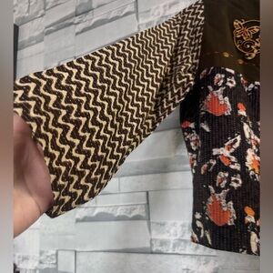 Stylish multicolor patchwork jacket with unique patterns and embellishments. Features a mix of black, orange, and brown tones.