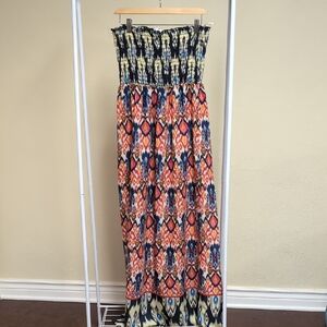Vibrant maxi skirt with a bold pattern. Features a smocked waist. Ideal for casual outings.