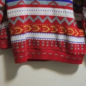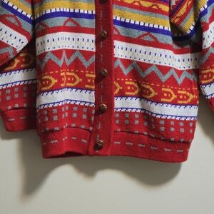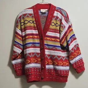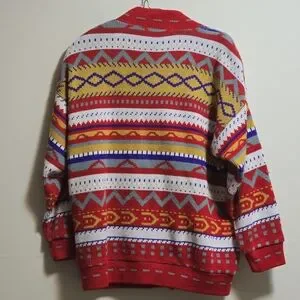 Stay stylish and warm with the multicolor patterned cardigan. Featuring vibrant red, yellow, and blue hues, this sweater is perfect for adding a pop of color to your wardrobe.