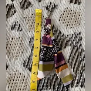 Stylish Purse scarf with a vibrant multicolor pattern. Features shades of purple, orange, green, and black with a unique design. Just clip it and go! Cute accessory for any purse or bag.