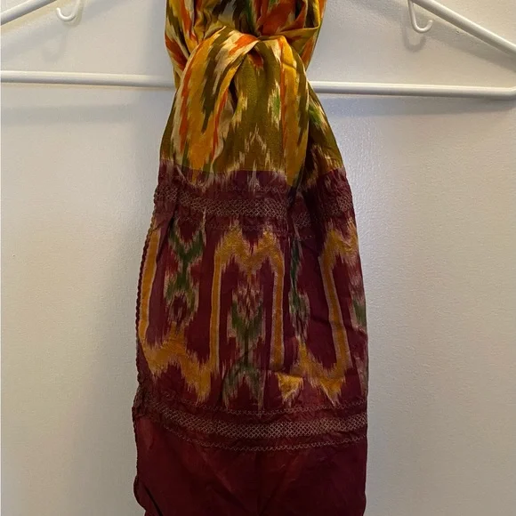 Vibrant scarf with a multicolor pattern. Features shades of red, yellow, and green.