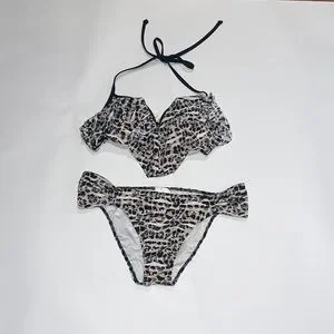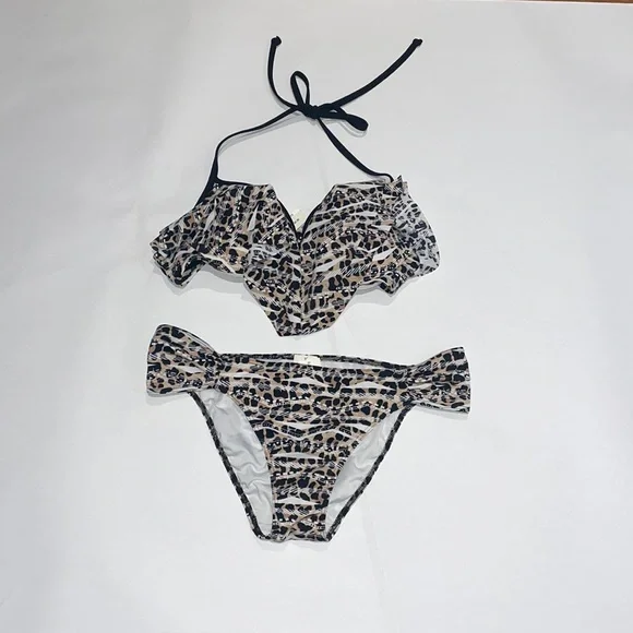 PINK Victoria's Secret Animal Print Ruffle Bikini Top and bottom size M . Adorable leopard inspired print ruffle over padded bandeau top, adjustable halter tie straps, adjustable back hook.