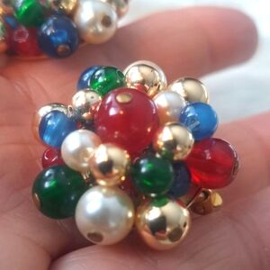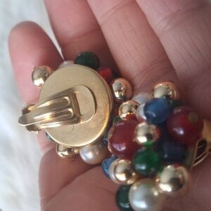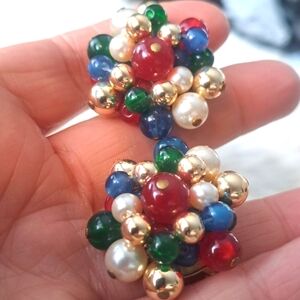 Clip-on earrings offer a fantastic alternative for those without pierced ears, allowing anyone to enjoy the beauty and flair of statement jewelry. This particular style, featuring beaded clusters in a striking combination of blue, gilt, red, and pearl, is exceptionally versatile. The interplay of these colors creates a look that can be both elegant and playful, easily transitioning from day to night. The lightweight construction of these earrings ensures comfort, even when worn for extended periods, making them a practical and stylish accessory. The delicate arrangement of beads allows for movement and sparkle, drawing attention to the wearer without feeling heavy or cumbersome.