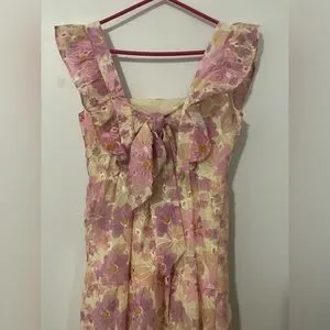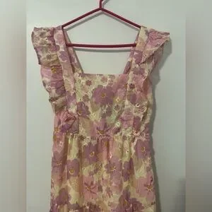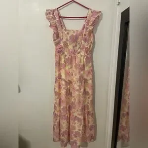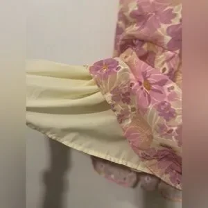 Elegant dress with floral pattern. Features yellow, pink, mauve, and light orange hues.