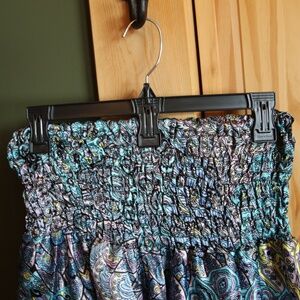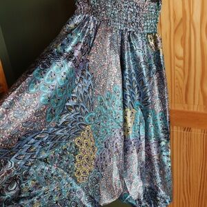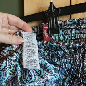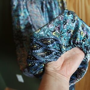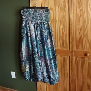 Multicoloured harem pants in a silky-feel polyester. Primarily light blue and pink with some yellow and black. Gathered/elastic waist and elastic cuffs. Definitely a statement piece.