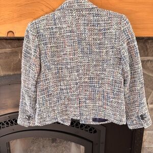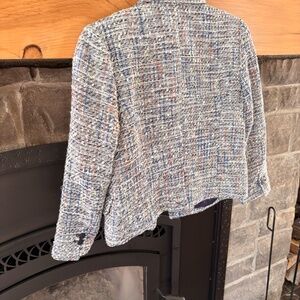 Crafted with a beautifully textured multicolour tweed featuring hints of [e.g., navy, gold, orange, yellow threads], this blazer is fully lined for comfort and structure. Front-facing pockets add functionality and style.
