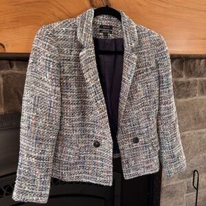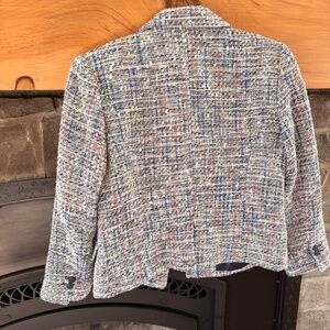 Channel timeless elegance with this stunning multicolour tweed cropped blazer, perfect for elevating your capsule wardrobe. This piece is Chanel-inspired, featuring a classic boxy cropped silhouette that hits at the waist, creating a flattering fit while adding a polished, vintage Parisian touch to any outfit.