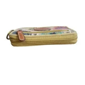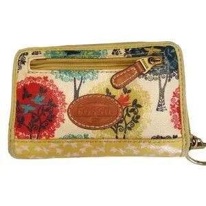 EUC Fossil Wallet with main colour being mustard yellow featuring folk-art style detailing in images on wallet.
