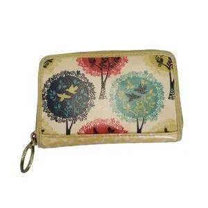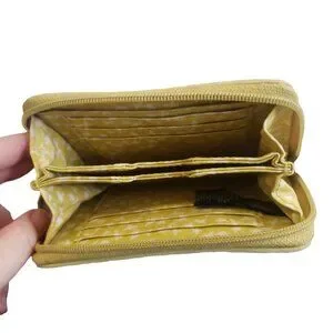 INSIDE WALLET DETAILS: Like new, Mustard yellow colour with small white birds featured, one large pocket and 3 card holders on one side, on other side 3 card holders. Centre has a pocket divider that can hold somethings as well.