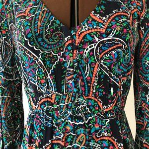 Easy wearing pullover multi-coloured dress has elasticized empire waist with button loop bodice, long button cuffed sleeves and circle ruffle hem.