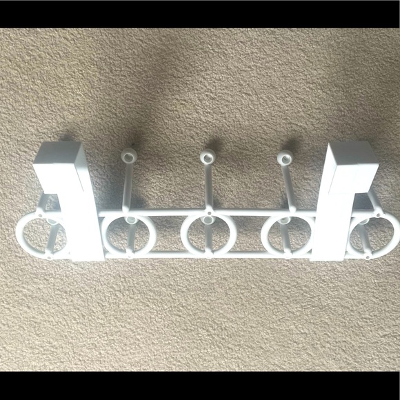 Plastic rack of 10 hooks can be hung over a door or mounted directly on a wall (see holes in frame, pics 2 & 4).