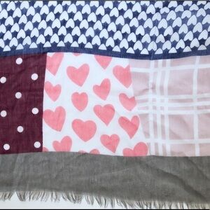 Multi-pattern scarf in grey, pink, blue and maroon.