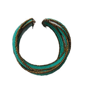 Beautifully coloured beads on intertwined cuff bangle/bracelet. Antique gold and bright turquoise opaque beads. Bit of Bollywood/Bohemian flair.