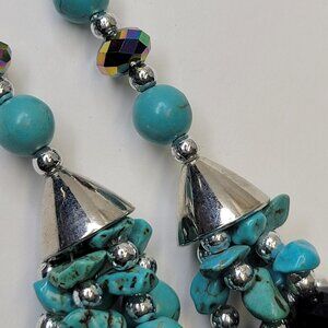 A silver tone triangular cap holds 5 strands of gorgeous turquoise colored and dark blue beads and howlite fashion chips intercepted with gleaming gold beads