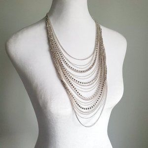 Multi-strand Silver Statement Bib Necklace Layered Chains Strands & Rhinestones