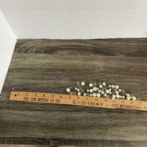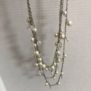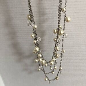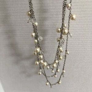 This elegant necklace features a stunning combination of silver and pearl elements, perfect for adding a touch of sophistication to any outfit. Faux pearls and I believe acrylic clear beads make this necklace lightweight and easy to wear all day long!