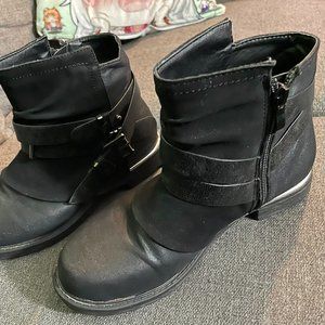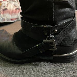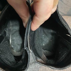 Bought these in Europe. They look amazing, and the fit is perfect except they're a tiny bit too thin on my wide feet. I can hardly wear them for an hour before my feet start hurting on the side of my pinky toes. I keep trying to wear them again and again but realistically, they're not for me, sadly... They have this slightly worn out look on the boots and straps (see zoomed in photo for texture), and the top front is like a suede sort of texture. With fun buckles and a chic look to them. They're just effortless, which is why I love them so much. Fit like a 37 or 38 (6.5 - 7 US) and would be perfect with thick socks if you're a 6.5, but not super warm for winter though. The insole lining (in black) has moved a bit but I don't feel it at all since it's the thinnest thing.