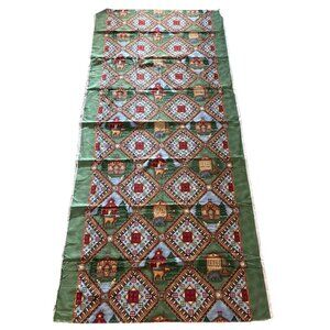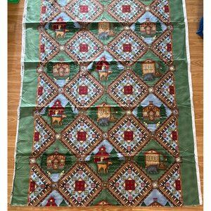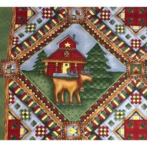 This fabric panel showcases a rustic cabin and wildlife theme with moose, bears, and decorative patterns, ideal for quilting or crafting projects.