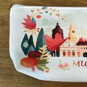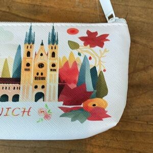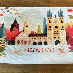 White pouch with colorful Munich architectural / church design. Features vibrant red, orange, and green accents.