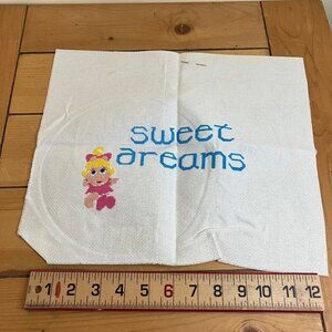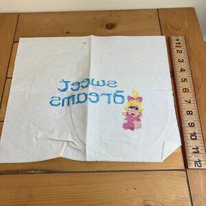 Vintage Just CrossStitch Muppet Babies "Sweet Dreams" #42051 counted cross stitch kit. Kit is open and has been partially stitched - text and Miss Piggy have been stitched as shown. Note that floss has not been sorted. Finished size 8 3/8" x 10 3/4".
