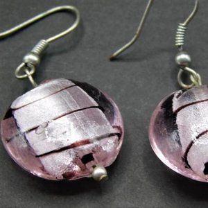 Murano coin shaped hand-blown glass earrings (disc slightly puffy) made by artisans in Murano, Italy. Pink glass with silver infusion that creates an opalescent sheen in the glass and black swirls is suspended on silver tone wire. No two pieces of hand-blown glass are identical.