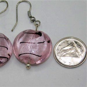 Murano coin shaped hand-blown glass earrings (disc slightly puffy) made by artisans in Murano, Italy. Pink glass with silver infusion that creates an opalescent sheen in the glass and black swirls is suspended on silver tone wire. No two pieces of hand-blown glass are identical.