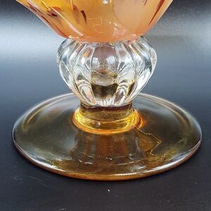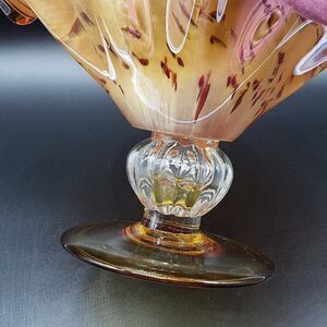 Murano Style Art Glass Amber Ruffled Console Bowl/Centrepiece. EUC with no signs of chips, cracks or scratches. Approx. size: 8.25" (w) x 12.5" (l) x 8" (h). Lovely thick glass in the style of Murano. Gorgeous rich amber colour with darker amber, cream and white leopard-like spots makes this art glass piece stand out beautifully. The sommerso style inlay of the pattern pops! and brings a rich vibrant glow to this wonderful art glass piece. Perfect as decor piece displayed on a table, console or counter in any home, office or store. Can also be used to hold fruits like banana bunches, etc. Absolutely fantastic example of art glass perfection!