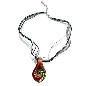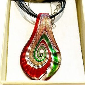 Murano Style Blown Glass Necklace Teardrop Red Green Silver Gold Swirl Sparkly