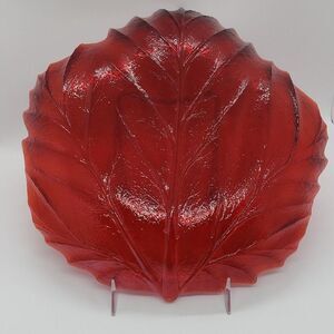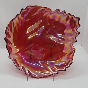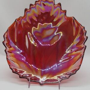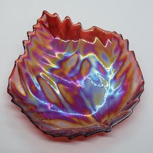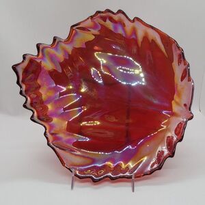 Murano Vintage Red Iridescent Carnival Art Glass Leaf-Shaped Bowl