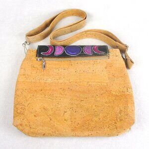 Shoulder / crossbody bag made of light brown natural cork with black leather flap and tassel.