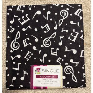 This 100% cotton fat quarter features a black background with white music note prints, ideal for sewing, quilting, and crafting projects.