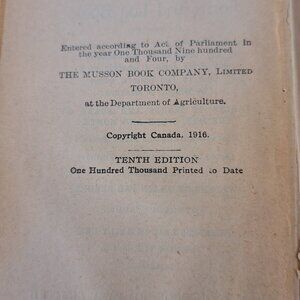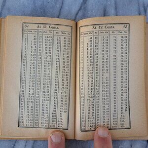 An antique form and log book published by Musson's in 1916 Canada, the "Ready Reckoner." It contains everything from tables multiplying prices to postage rates to board measures, interest rates and business forms. Someone signed their name on the inside cover but, save for the first few pages, the pages are still firmly attached to the spine.
