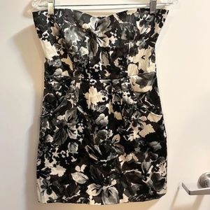 Must Have grey and black floral strapless mini dress with pockets! Super cute in excellent condition! Not sure of the size but I think a size 8. Measurements seen in photos. Stretchy fabric.