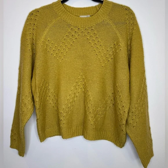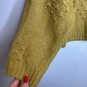 Cozy and stylish mustard chartreuse pointelle knit sweater perfect for any occasion. Soft fabric and intricate design make it a wardrobe essential.