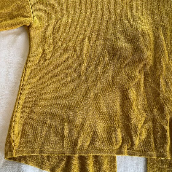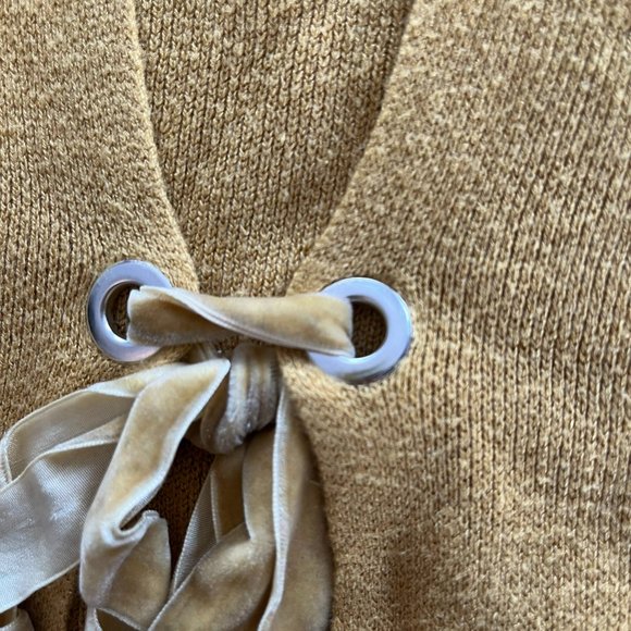 This sweater is such a statement. Mustard yellow, thick material. Back has a cut out with metal gromets for a velvet ribbon to tie the back closed. Great on its own or with a top underneath. Tag says one-size but I would say it has a medium fit!