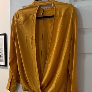 Elegant golden blouse with button-up design. Ideal for versatile styling.