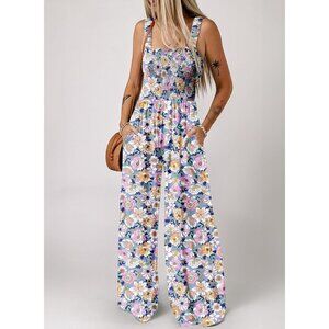 Muted Floral Pattern Smocked Top Sleeveless Jumpsuit Pink Purple