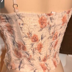Elegant floral dress with spaghetti straps. Features a beautiful mix of orange and cream colors.